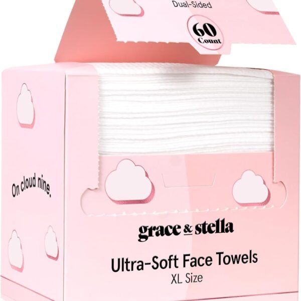 grace & stella Face Towels Disposable – Travel Essentials – Ultra-Soft & Absorbent Face Wipes Towelettes – XL Facial Towels for Cleansing & Makeup Removal – Lint-Free Facial Tissue – Vegan (60 Count)