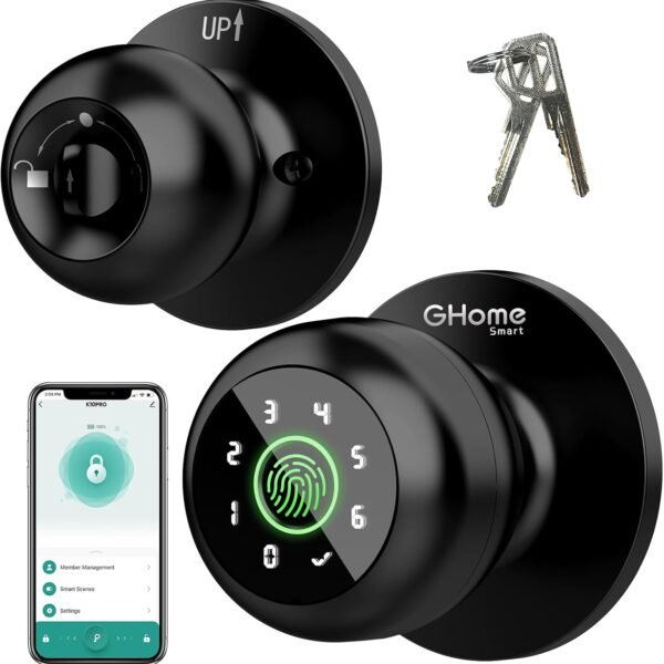 GHome Smart Fingerprint Door Lock, 4 in 1 Smart Fingerprint Door Knob with Keypad, App Control, Auto Lock, Biometric Door Knob with Lock for Bedroom, Apartment, Garage, Home & Office