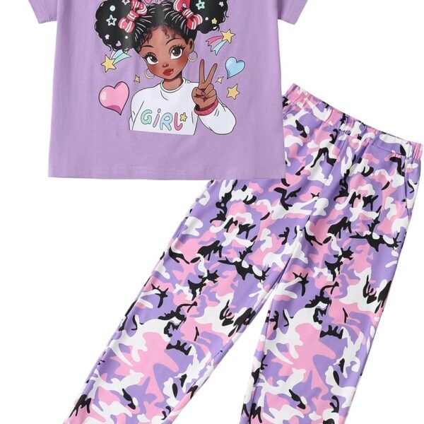 mksodop Girls Clothes 2 Pieces Solid Color Short Sleeve Fashion Printed T-Shirt and Camouflage Pants Girls Outfits Set