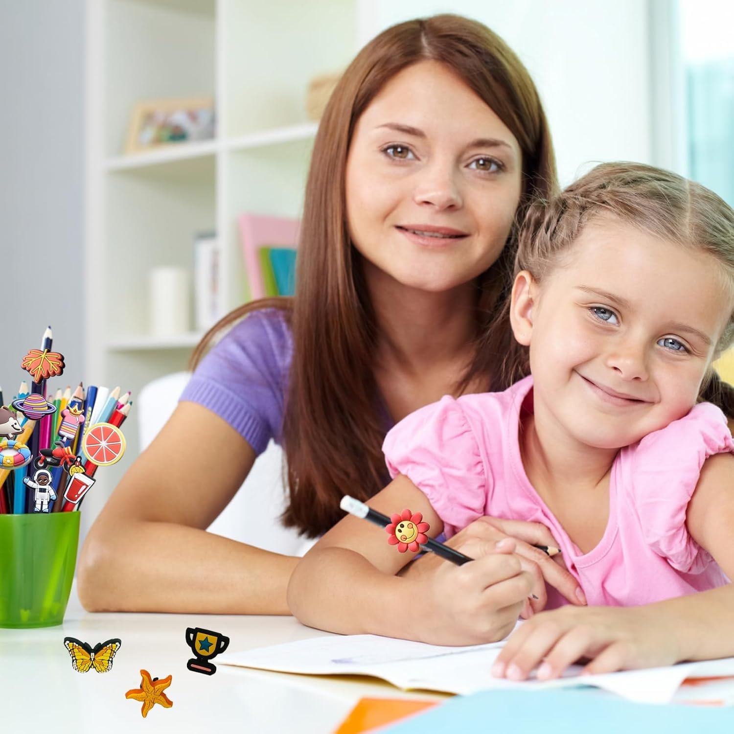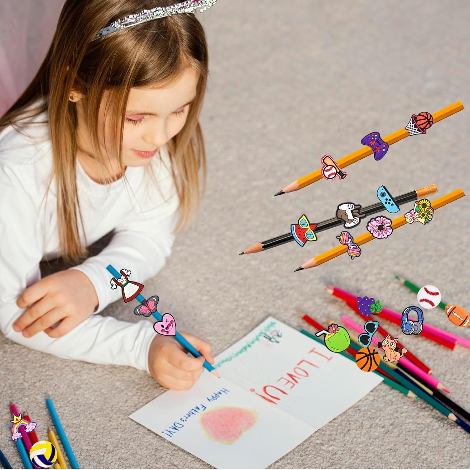 pencil charms A combination of Lot Trendy variety and Classic ones~ Including Flower,Sports Ball,Insect,Animals,Plant,Rainbow,Cars,Heart,Butterfly….Ideal for Family Rewards, classroom prizes, and More!