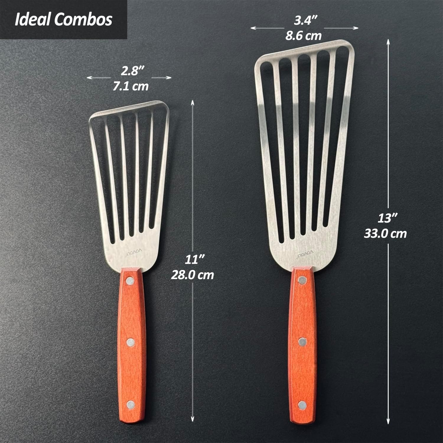 2 Pack Fish Spatula Turner, Stainless Steel Slotted Spatulas for Flipping, Turning, Frying & Grilling, 3″x6″+4″x8″ Metal Slotted Spatulas, Wooden Full Tang Handle & Curved Blade