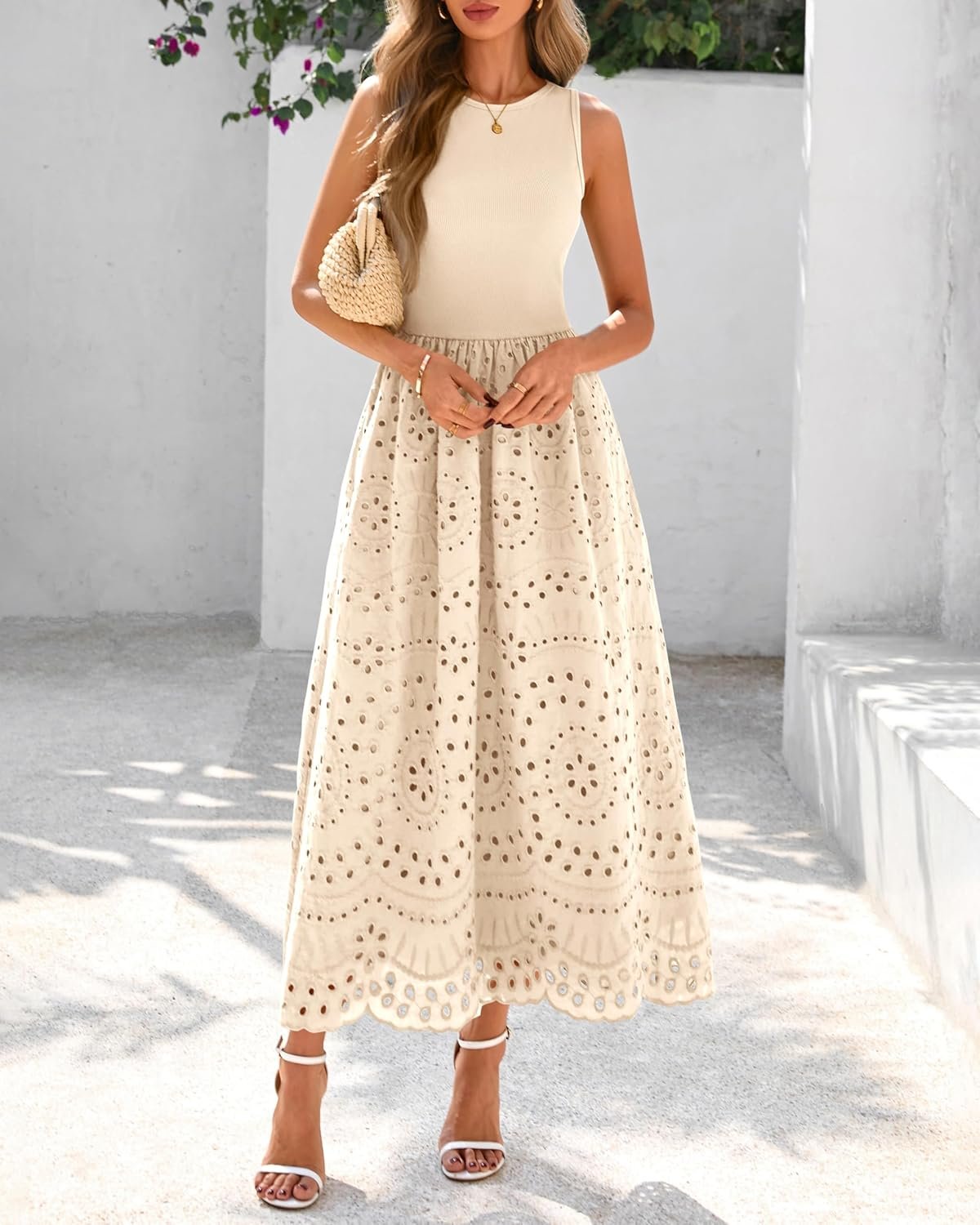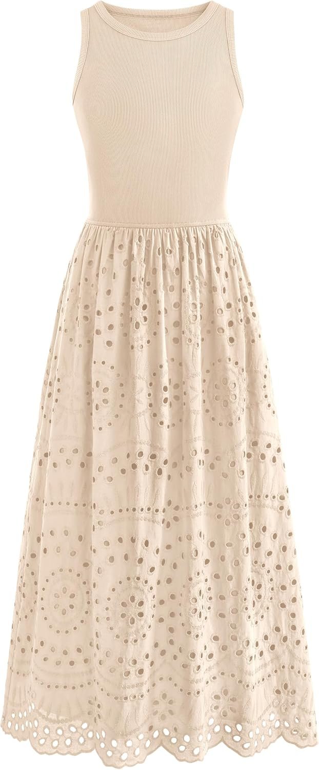 dowerme Women Summer Dresses 2026 Casual Sleeveless Crewneck A-Line Boho Lace Eyelet Cotton Tank Maxi Dress with Pockets