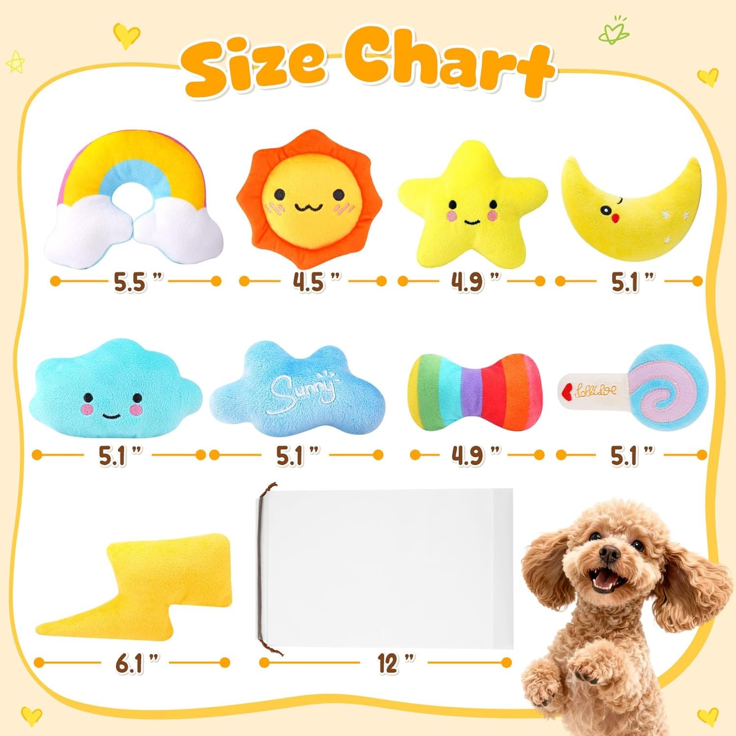 Unbox Joy for Your Pup:This set includes 9 adorable squeak toys in various shapes and colors. Specially designed for puppies and small dogs to chew, fetch, and cuddle.The set also comes with a convenient storage bag for easy storage and on-the-go play