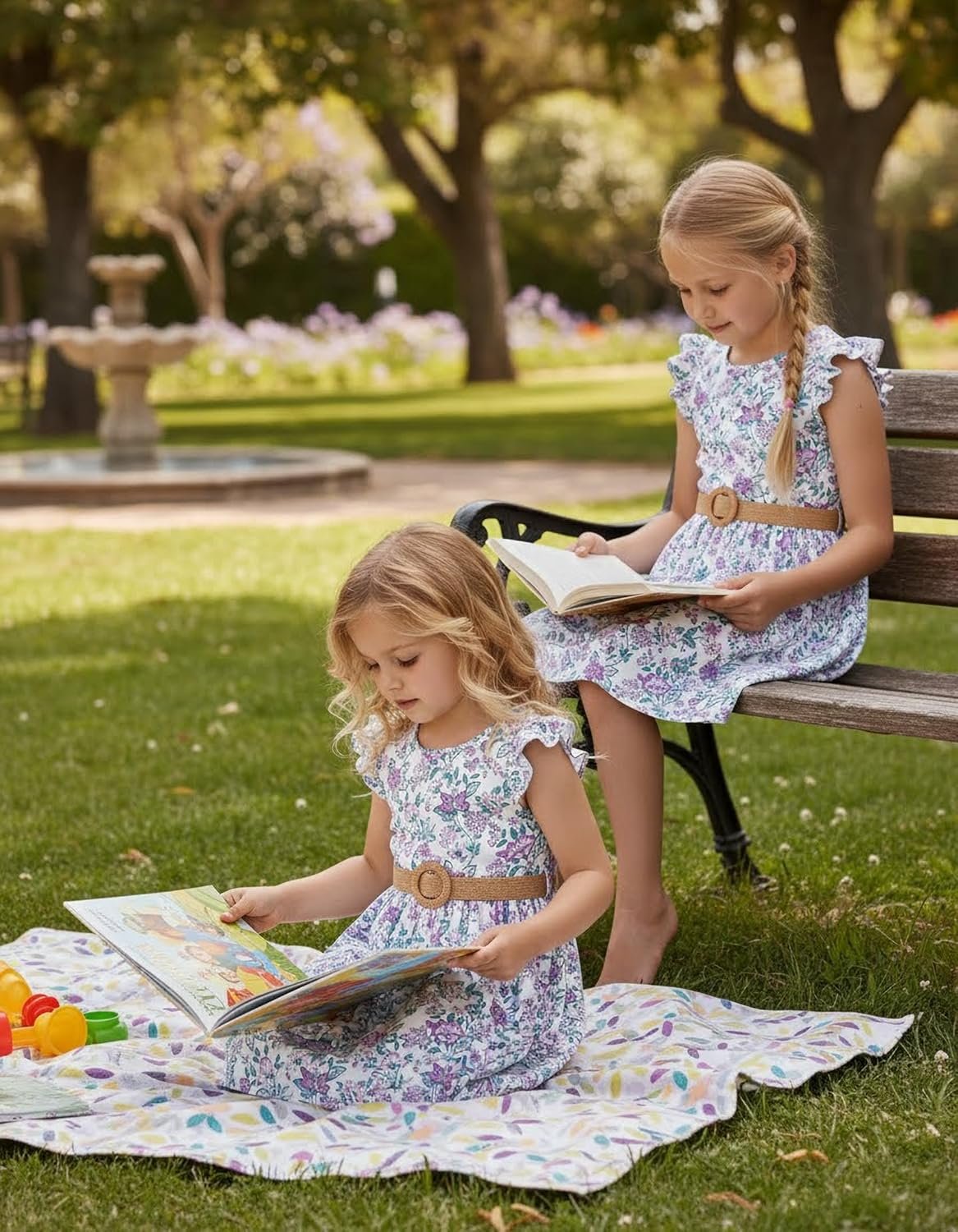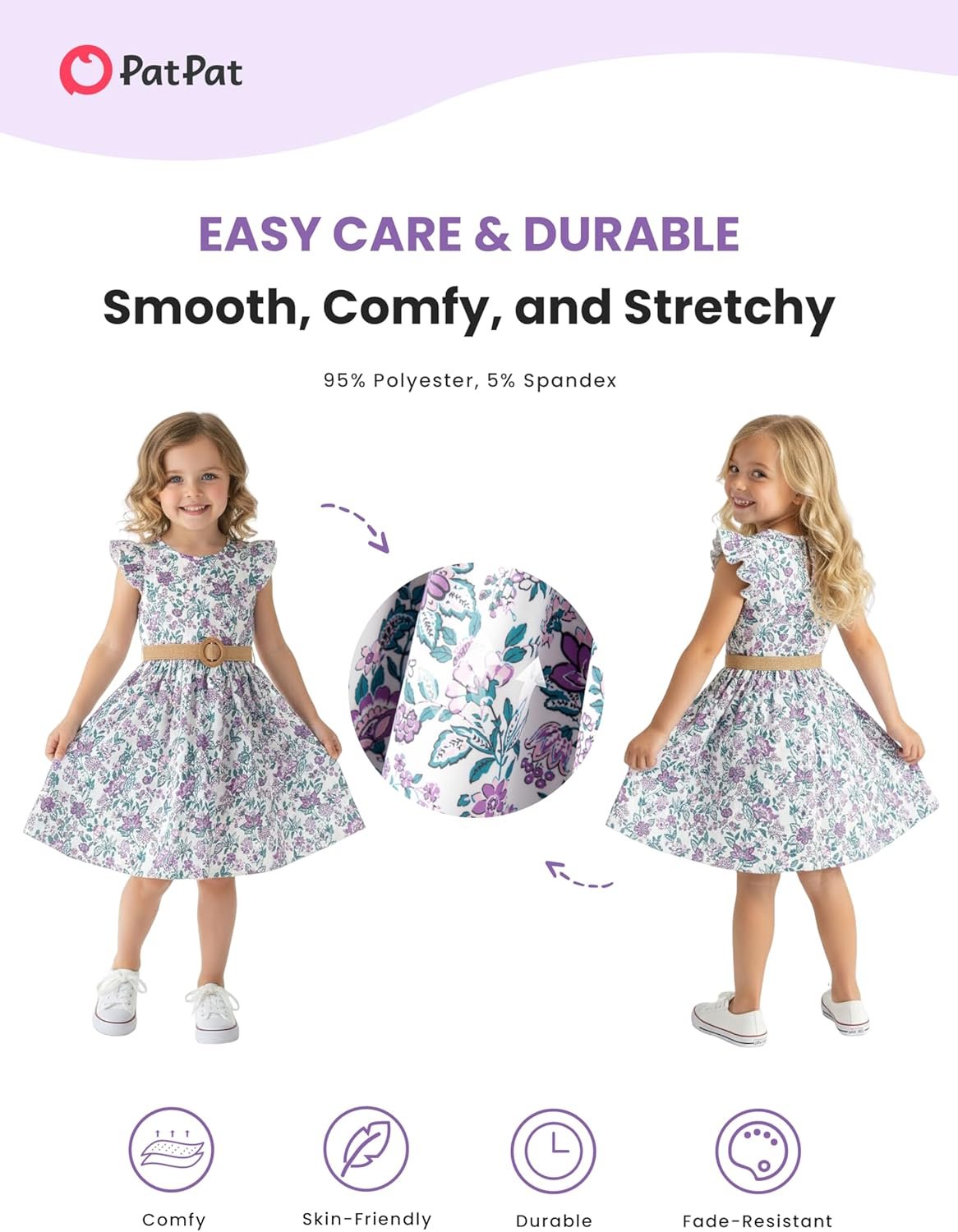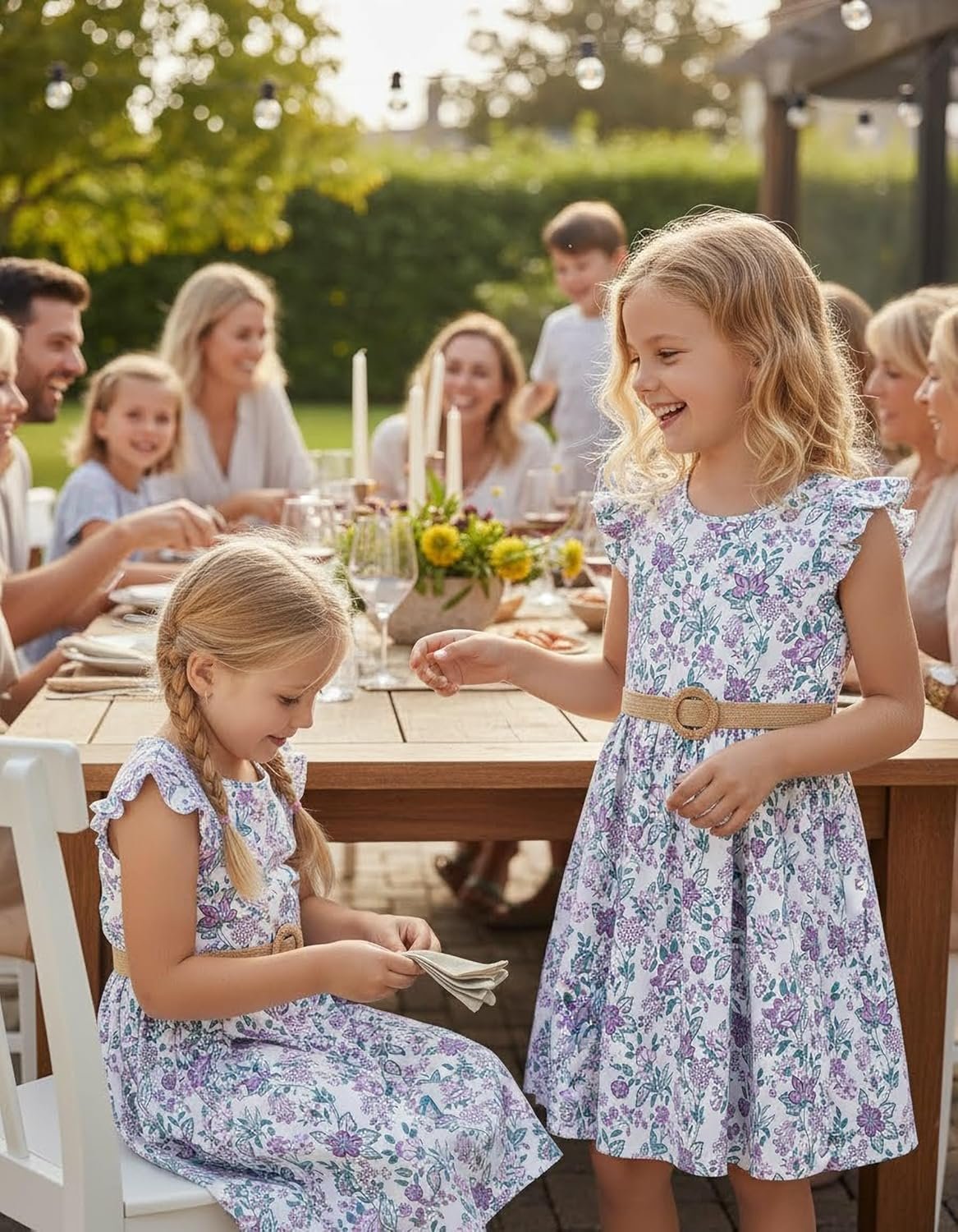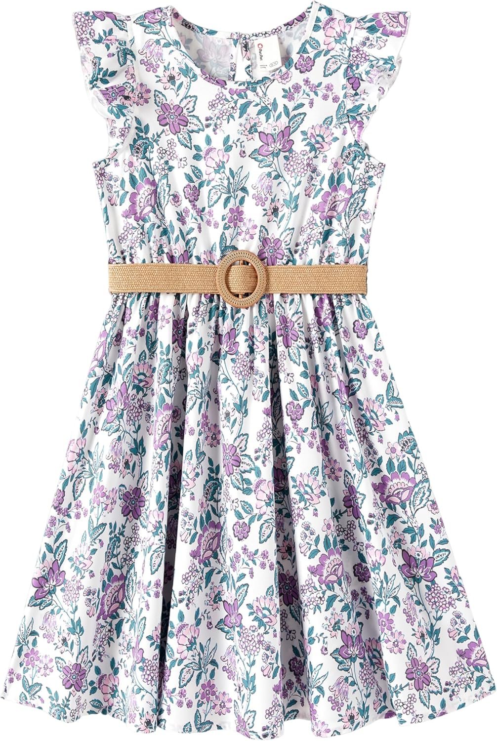 PATPAT Little Big Girls Dress Vintage Boho Floral Ruffle Short Sleeve Casual Swing Dress with Braided Belt