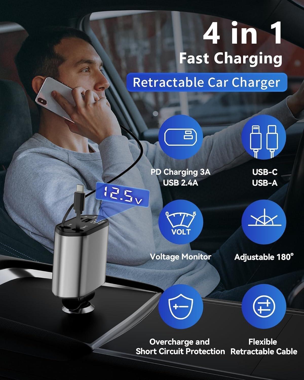 Retractable Car Charger, 4 in 1 Fast Charging Car Charger USB-C & USB-A Compatible with iPhone 16/15/14/13/12/11/X,Galaxy,Pixel