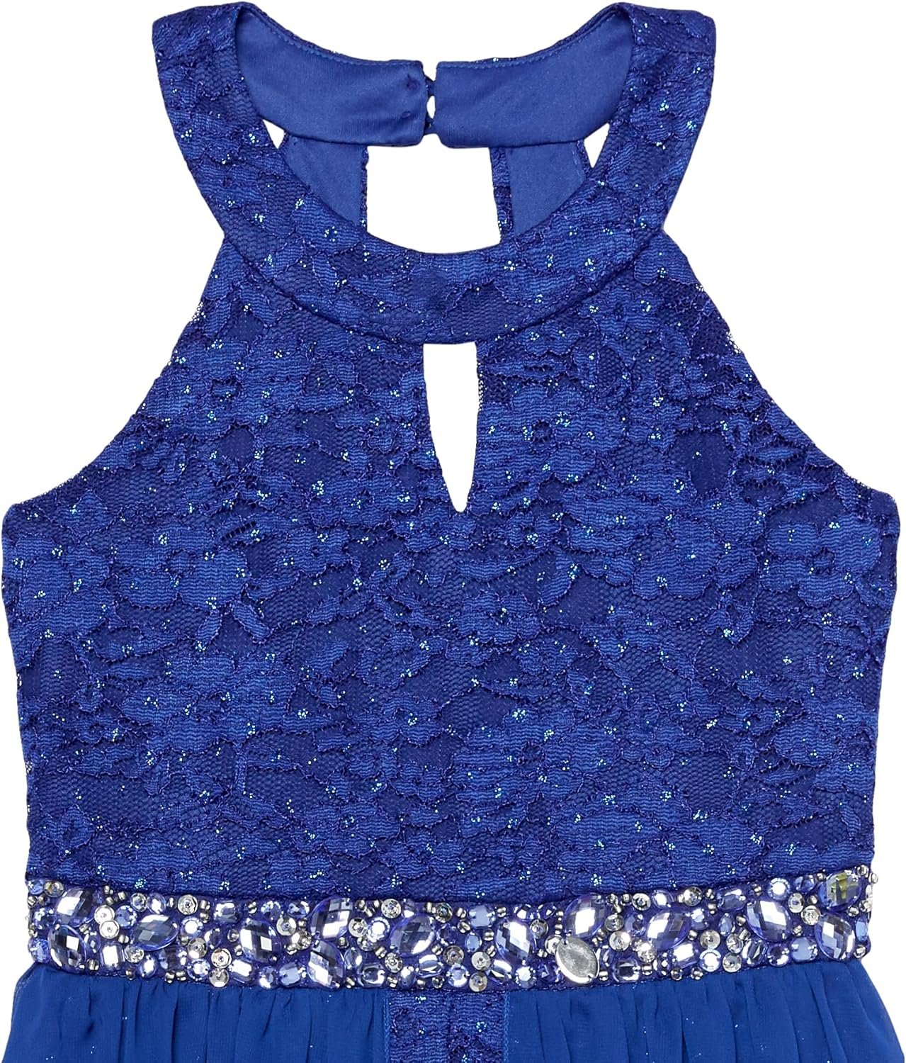 Make her feel like a star in the Speechless Girls’ High Neck Romper Maxi Walk-Through Party Dress – a perfect blend of elegance, glamour, and modern style. This stunning dress features an all-over sparkle lace romper with a flowing chiffon overlay, creating a beautiful high-low effect that’s perfect for any special occasion. The sleeveless high-neck design adds a sophisticated touch, while the keyhole cutout detail gives it a trendy and stylish flair. A dazzling jeweled waistline effortlessly connects the romper to the full-length chiffon skirt, adding a touch of sparkle and making her stand out at weddings, school dances, holiday parties, and more. Whether she’s celebrating a birthday, attending a formal event, or dressing up for a family gathering, this dress is the perfect choice for making unforgettable memories.
