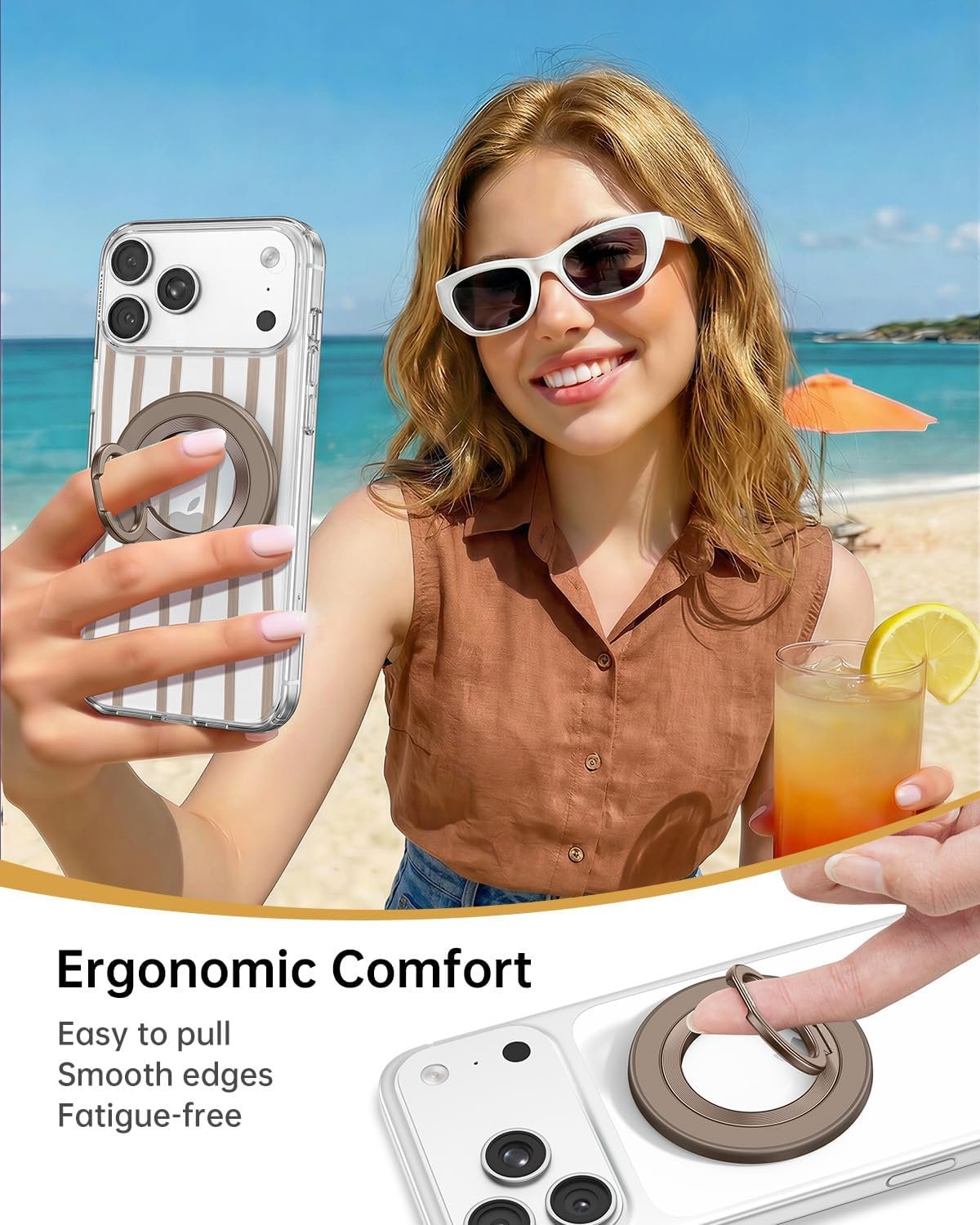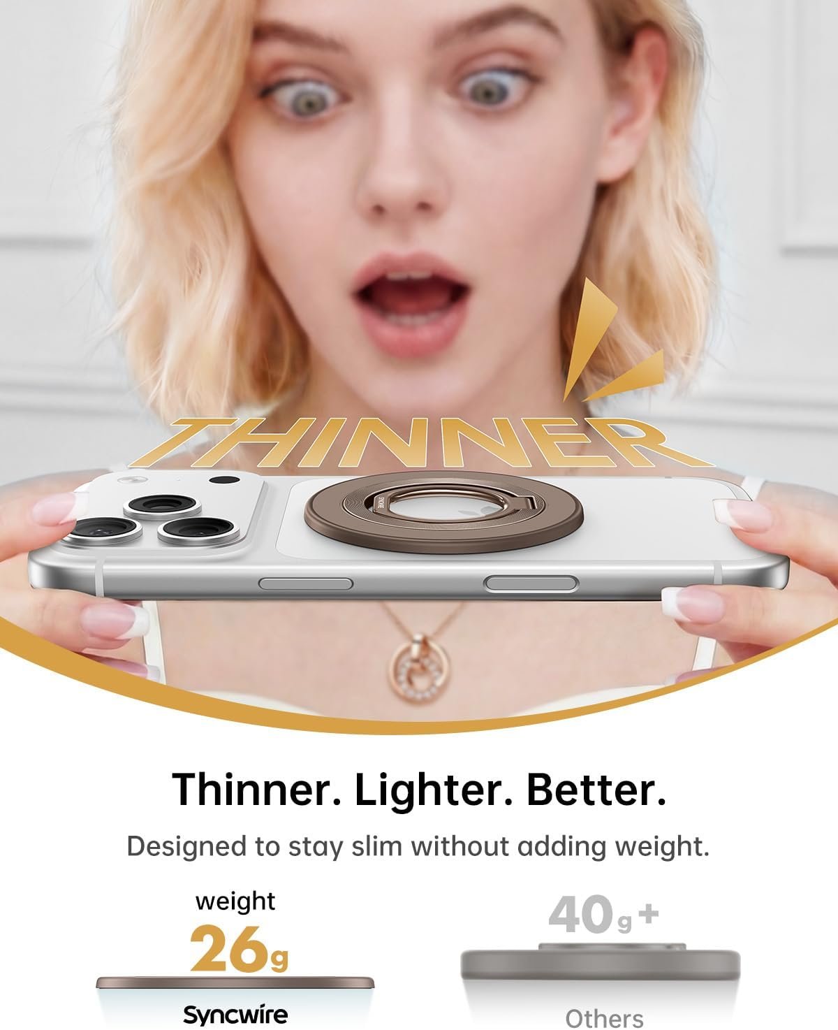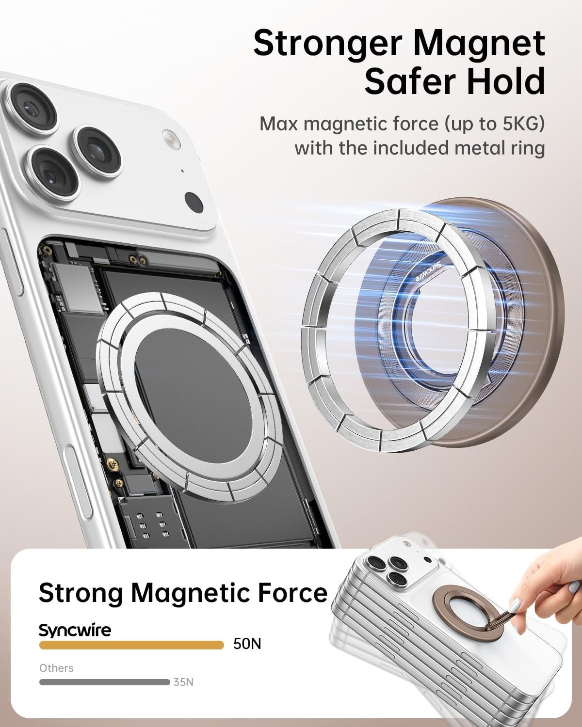 【Super Strong Magnetic】The Syncwire MagSafe phone ring holder is made with N55 NdFeB magnets, providing exceptional magnetic force. You can securely attach your phone to the MagSafe magnetic phone ring holder with just one finger, experiencing a strong hold that resists shaking or movement. The magnetic force can be enhanced by 5 times when used with the provided metal ring.