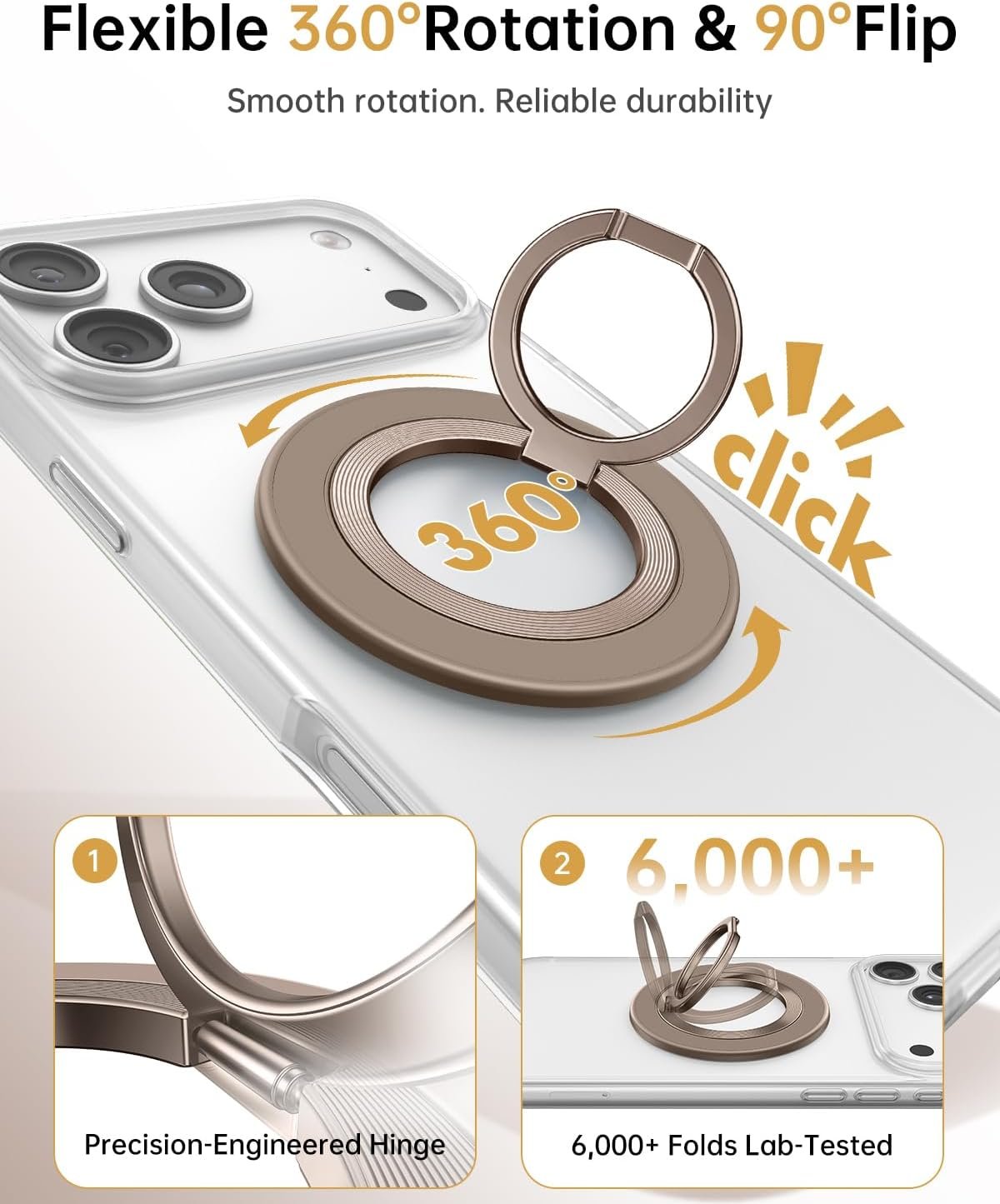 【360° Rotation & 90° Flip】Multi-angle adjustment provide flexible & comfortable hand grab and excellent viewing angle. This ring holder is tested to withstand over 6000 times of folding without getting loose, greatly improving durability.