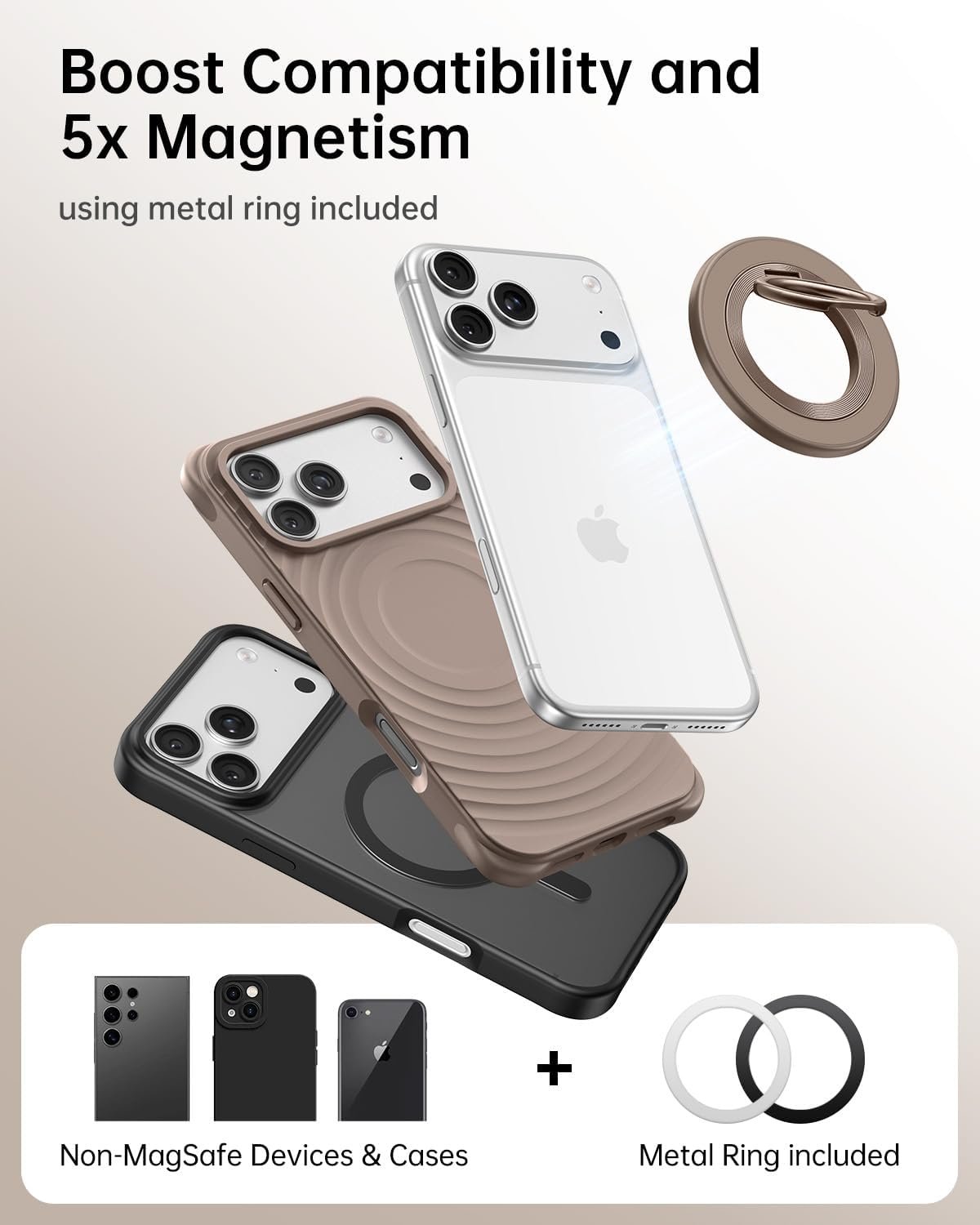 【Kindly be aware that】1.Please remove the phone ring holder for wireless charging. 2.Make sure to remove the phone ring holder by sliding it sideways to prevent the metal rings(if applied) from falling off. 3. The included metal ring does not interfere with wireless charging, however, ensure proper alignment with your phone’s charging coil to avoid any disruption in wireless charging.