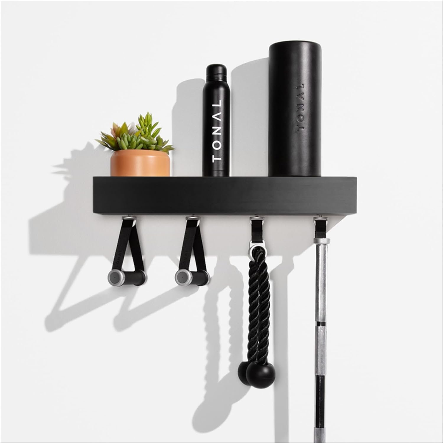 Our floating shelf is the perfect way to store all your Tonal accessories. Its sleek, versatile design makes this an easy fit with any style room. Available in Coffee Oak, as well as Matte Black and Light Aged Ash.