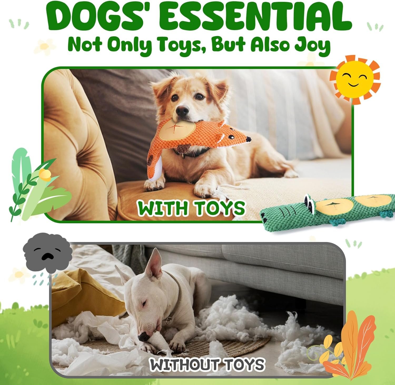 Multiple Funny Sounds: Except for attractive look, both toys can make squeaky and crinkle sounds to better attract your dog’s interest. Plus, each toy has a pocket for inserting a plastic bottle (500 ml max) to make it crunch, which will excite your dog